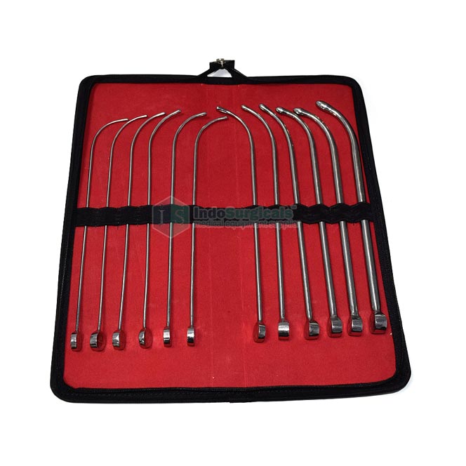 Bougie Set is a specialized medical instrument kit used primarily for the gradual dilation or probing of narrow or strictured passages in the body, such as the esophagus, urethra, or cervix. The set typically includes a series of slender, flexible, or semi-rigid dilators (bougies) of varying diameters designed to gently and safely widen constricted areas to facilitate diagnostic or therapeutic procedures.