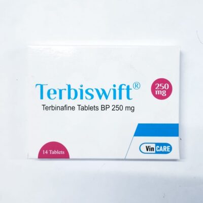 TERBISWIFT Terbinafine 250 mg Tablets (14’s) are oral antifungal tablets designed for the effective treatment of stubborn and deep fungal infections of the skin, nails, and scalp. Each tablet contains 250 mg of Terbinafine Hydrochloride, a potent allylamine antifungal that works by inhibiting ergosterol synthesis, a key component of fungal cell membranes. This action leads to fungal cell death and supports the clearance of infection.